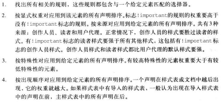 以及按角色分为创作人员样式、读者样式和用户代理样式。其中用户代理样式的优先级最低。一般而言创作人员样式优先级最高,除了读者样式设置为!important的情况,这种情况就算是创作人员样式设置为!important都是比他弱的。