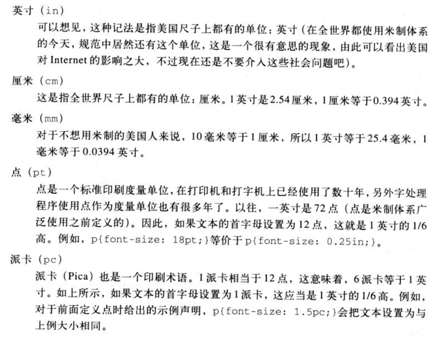 绝对长度:in、cm、mm、pt、pc